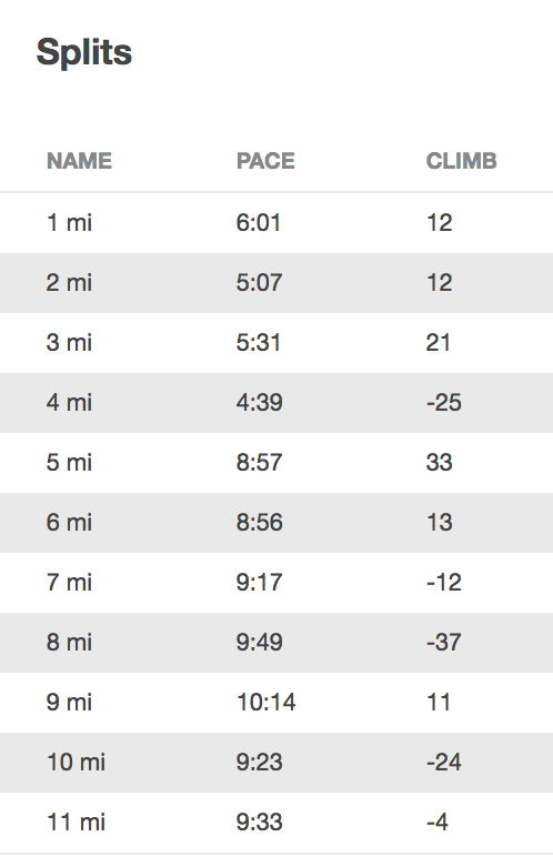 The GPS was acting funky and incorrectly recorded the distance and speed for the first few miles. This was closer to 8.5 miles and a 9:30 min. pace.