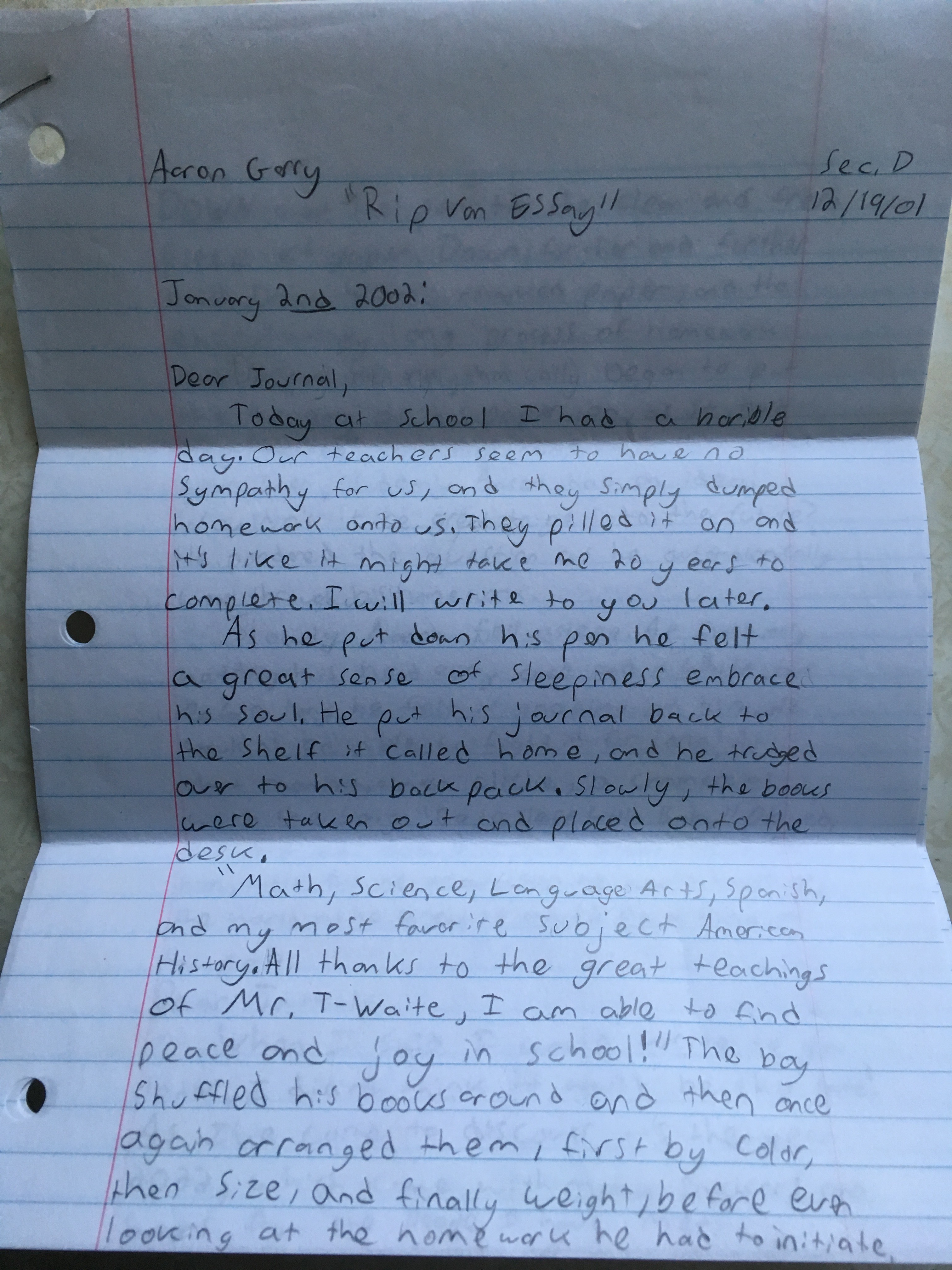 It turns out I was snarky then (and I still got it!), laid on the sarcasm (ala, “All thanks to the great teachings of Mr. T-Waite, I am able to find peace and joy in school!”), and full of ambitious predictions about the future.
