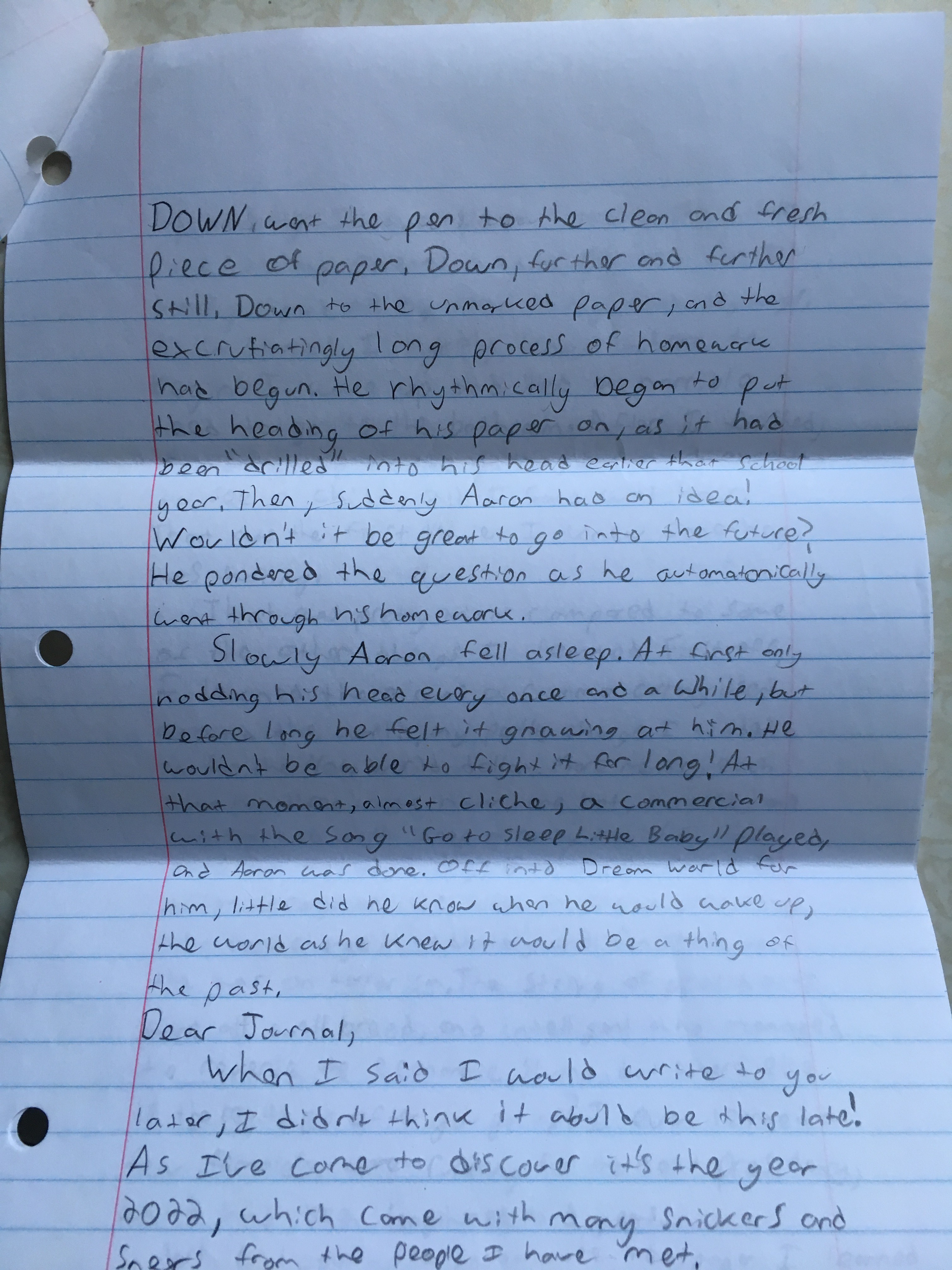 DOWN went the pen to the clean and fresh piece of paper. Down, further and further still. Down to the unmarked paper, and the excruciatingly long process of homework had begun. He rhythmically began to put the heading of his paper on, as it had been “drilled” into his head earlier that school year. Then, suddenly Aaron had an idea!” Wouldn’t it be great to go into the future? He pondered the question as he automatonically went through his homework.