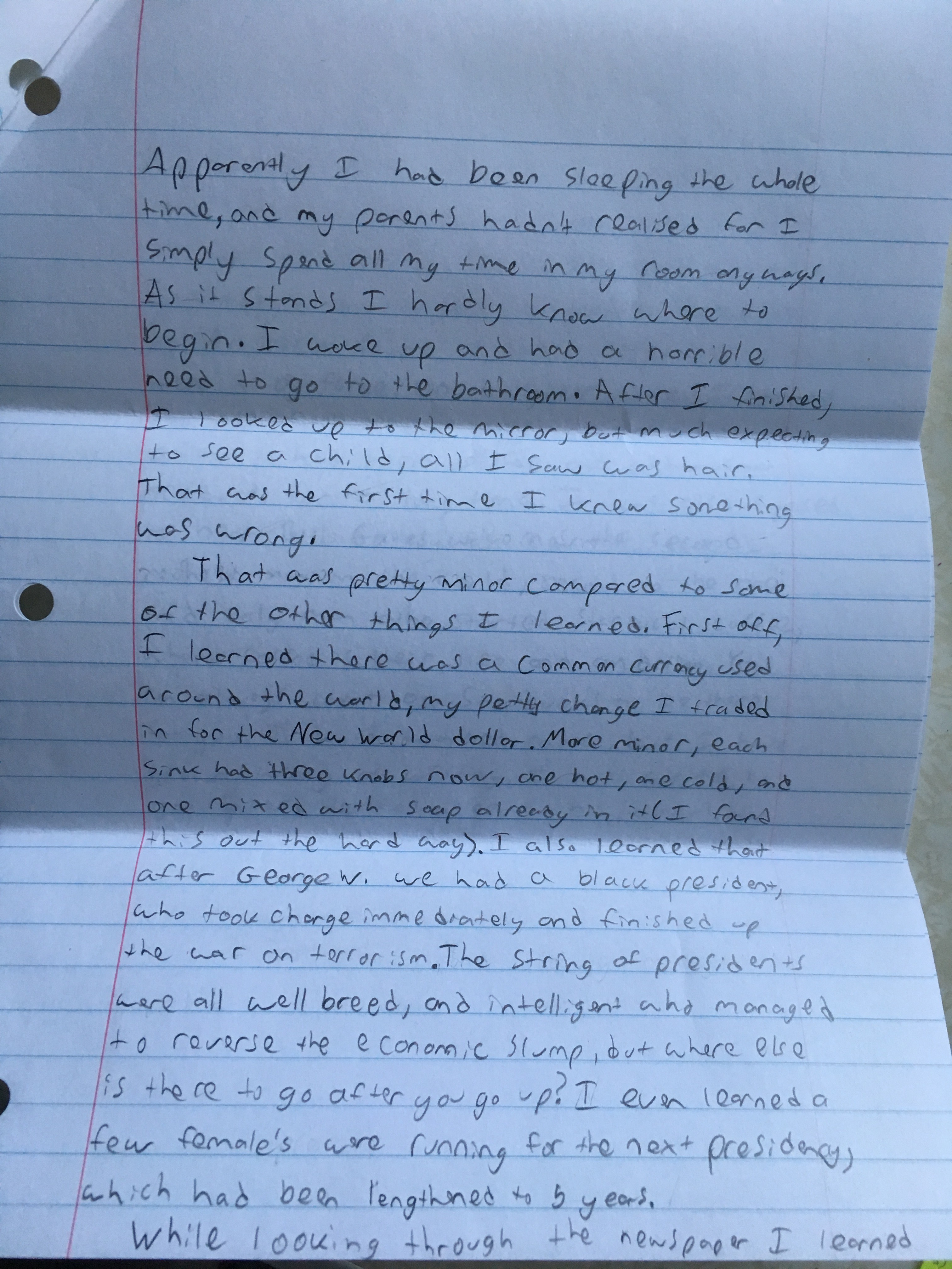 When I said I would write to you later, I didn’t think it would be this late! As I’ve come to discover it’s the year 2022, which came with many snickers and sneers from the people I have met. Apparently I had been sleeping the whole time, and my parents hadn’t realised for I simply spend all my time in my room anyways. As it stands I hardly know where to begin. I woke up and had a horrible need to go to the bathroom. After I finished, I looked up to the mirror, but much expecting to see a child, all I saw was hair. That was the first time I knew something was wrong.