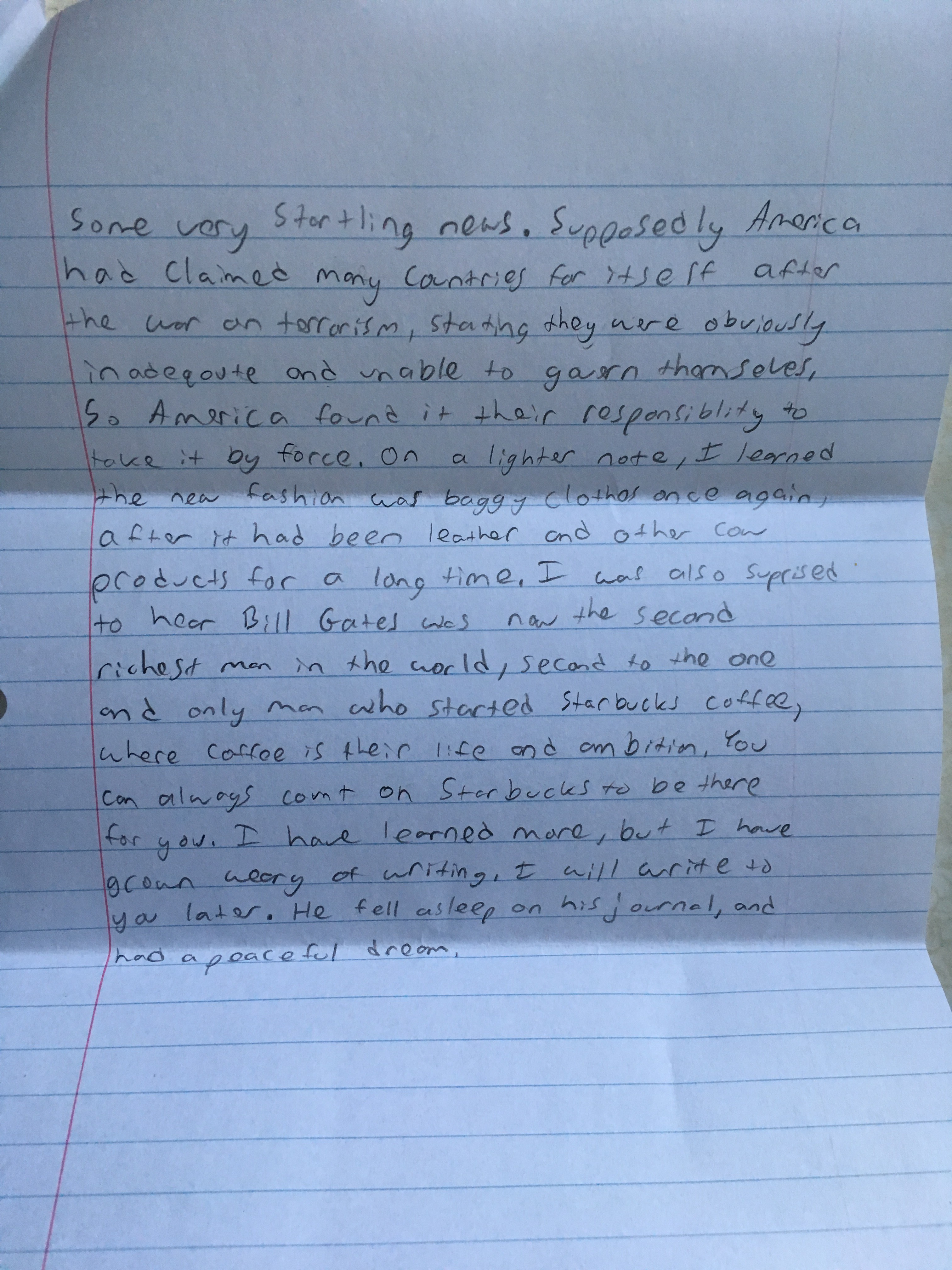 While looking through the newspaper I learned some very startling news. Supposedly America had claimed many countries for itself after the war on terrorism, stating they were obviously inadequote and unable to govern themselves, so America found it their responsibility to take it by force. On a lighter note, I learned the new fashion was baggy clothes once again, after it had been leather and other cow products for a long time. I was also suprised to hear Bill Gates was now the second richest man in the world, second to the one and only man who started Starbucks coffee, where coffee is their life and ambition. You can always count on Starbucks to be there for you. I have learned more, but I have grown weary of writing. I will write to you later. He fell asleep on his journal, and had a peaceful dream.