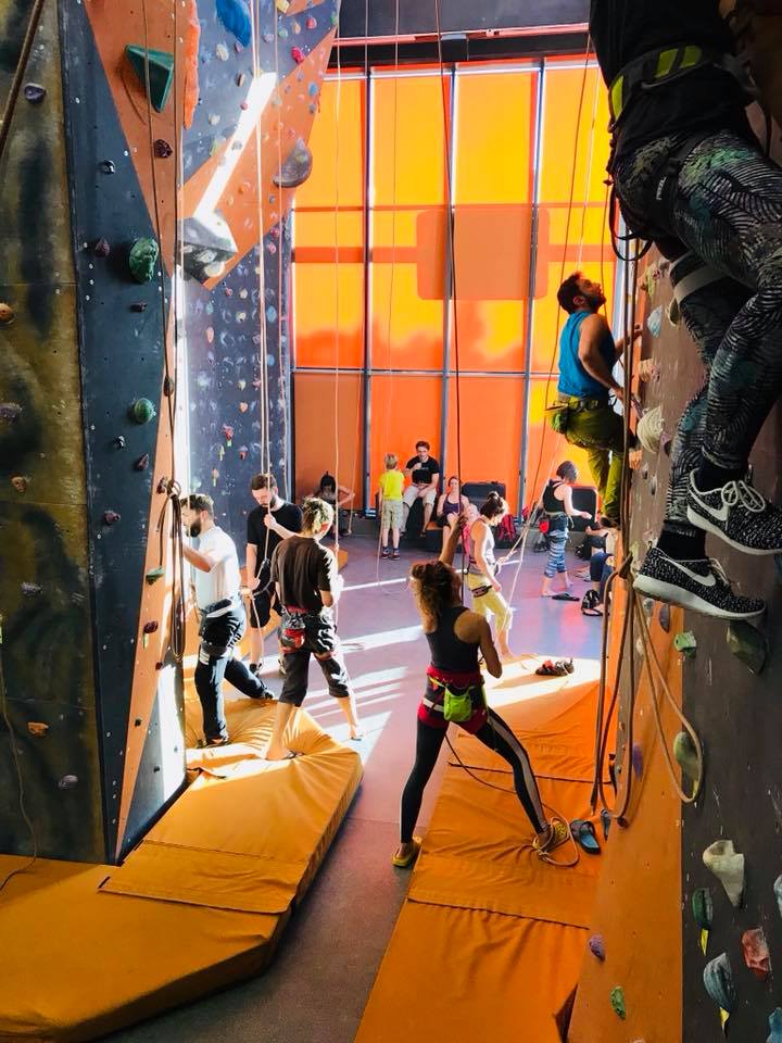 The gym itself is bathed in light with floor to ceiling windows on three sides. The place is cozy without feeling cramped, and amazingly, it packs in over 50 routes up to 14 meters high. Given the strength of the instructors (many have competed on the national team), the setting is high quality, catering to the moderate range. There is a bouldering area with plenty of features to keep it interesting, and a workout space that doubles as a yoga room.