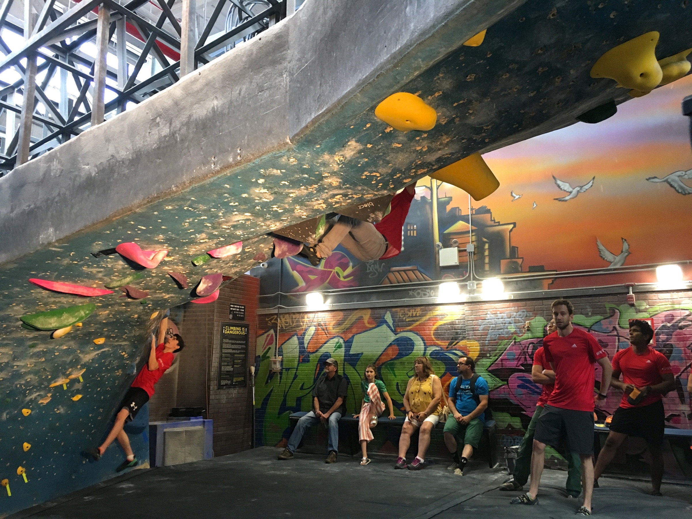 I tried working a pink in the mid-30s, what others called, “maybe a V9.” Not knowing the grades and in the light of competition, it was fun to jump on random problems that caught the eye.