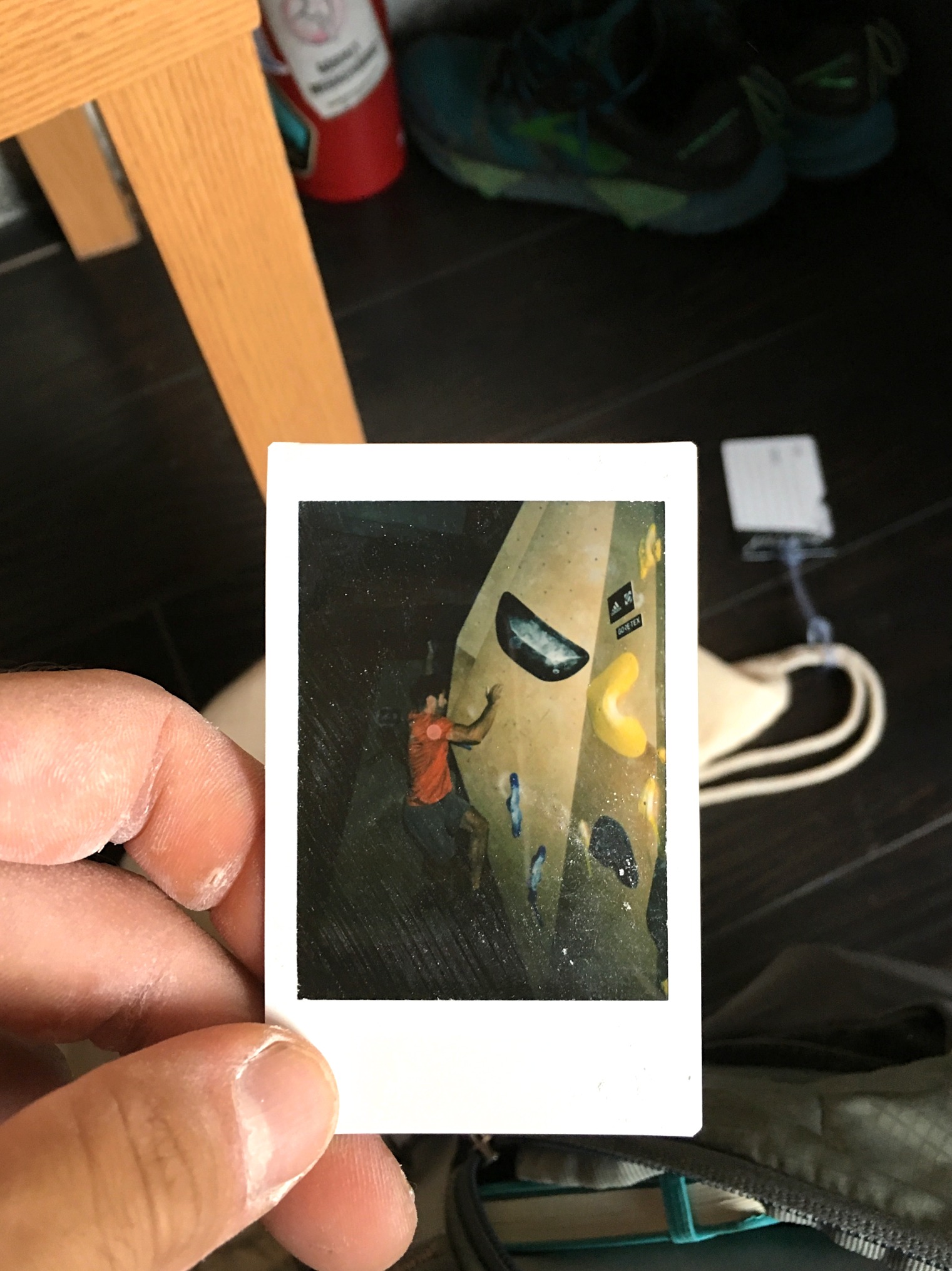 Climbers cruise a slightly overhanging moderate comprised of downward facing pinches on sloping feet, pink holds. The feeling I always get in a new gym washes over me: “I wonder if I’m gonna eat shit on these?” As if all of a sudden I’ll forget how to climb and any technical ability beyond flopping will escape me.